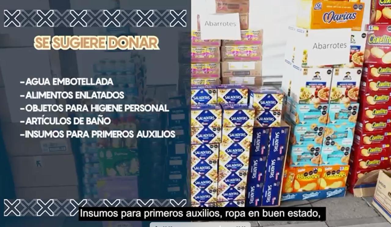 El centro de acopio, ubicado en “Las Velarias”, a un costado del Helipuerto del Palacio Legislativo de San Lázaro (entrada por Puerta 7); se sugiere donar los siguientes artículos: agua embotellada, alimentos enlatados, objetos para higiene personal como jabón, pasta de dientes y cepillos dentales.