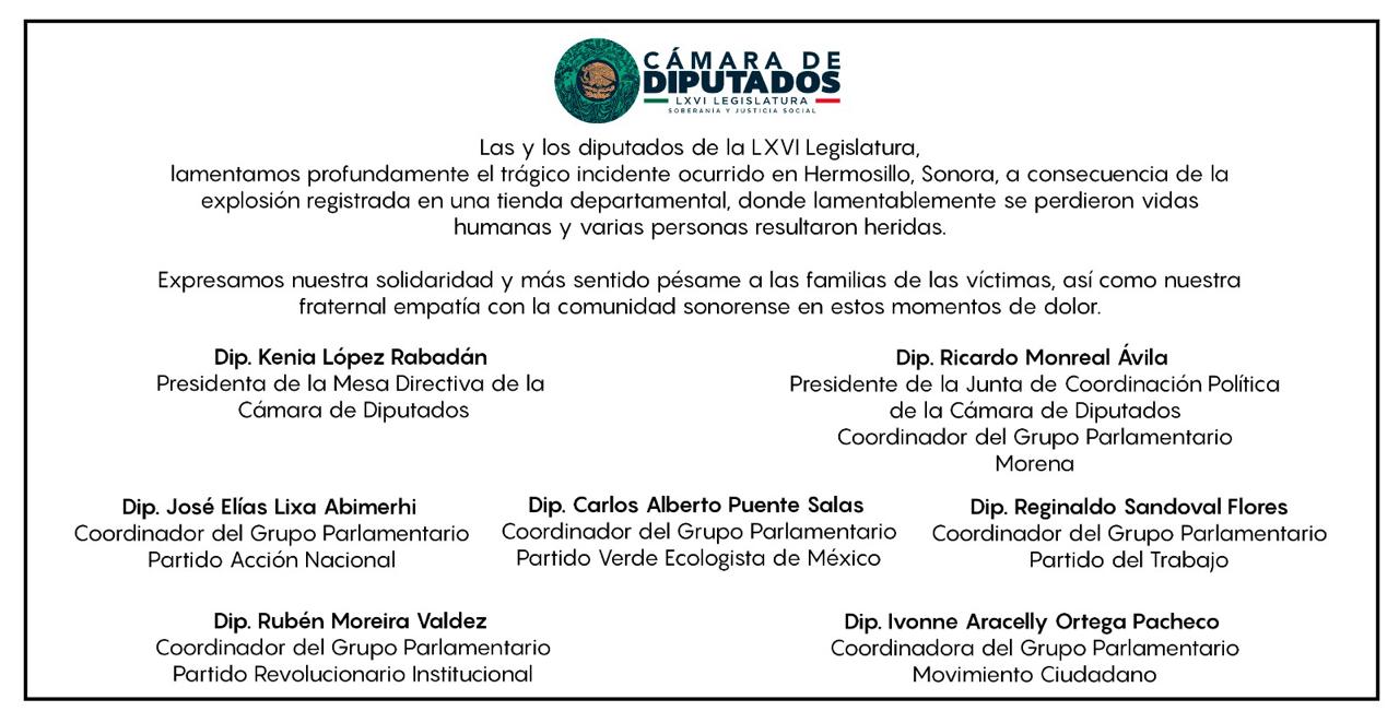 Las y los diputados de la LXVI Legislatura, lamentamos profundamente el trágico incidente ocurrido en Hermosillo, Sonora, a consecuencia de la explosión registrada en una tienda departamental, donde lamentablemente se perdieron vidas humanas y varias personas resultaron heridas.