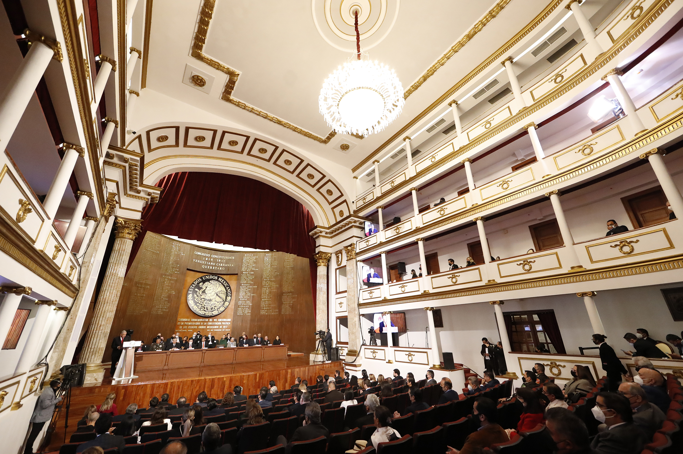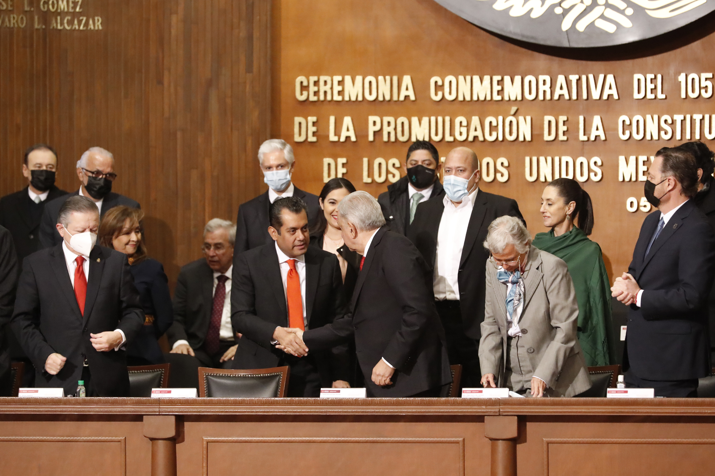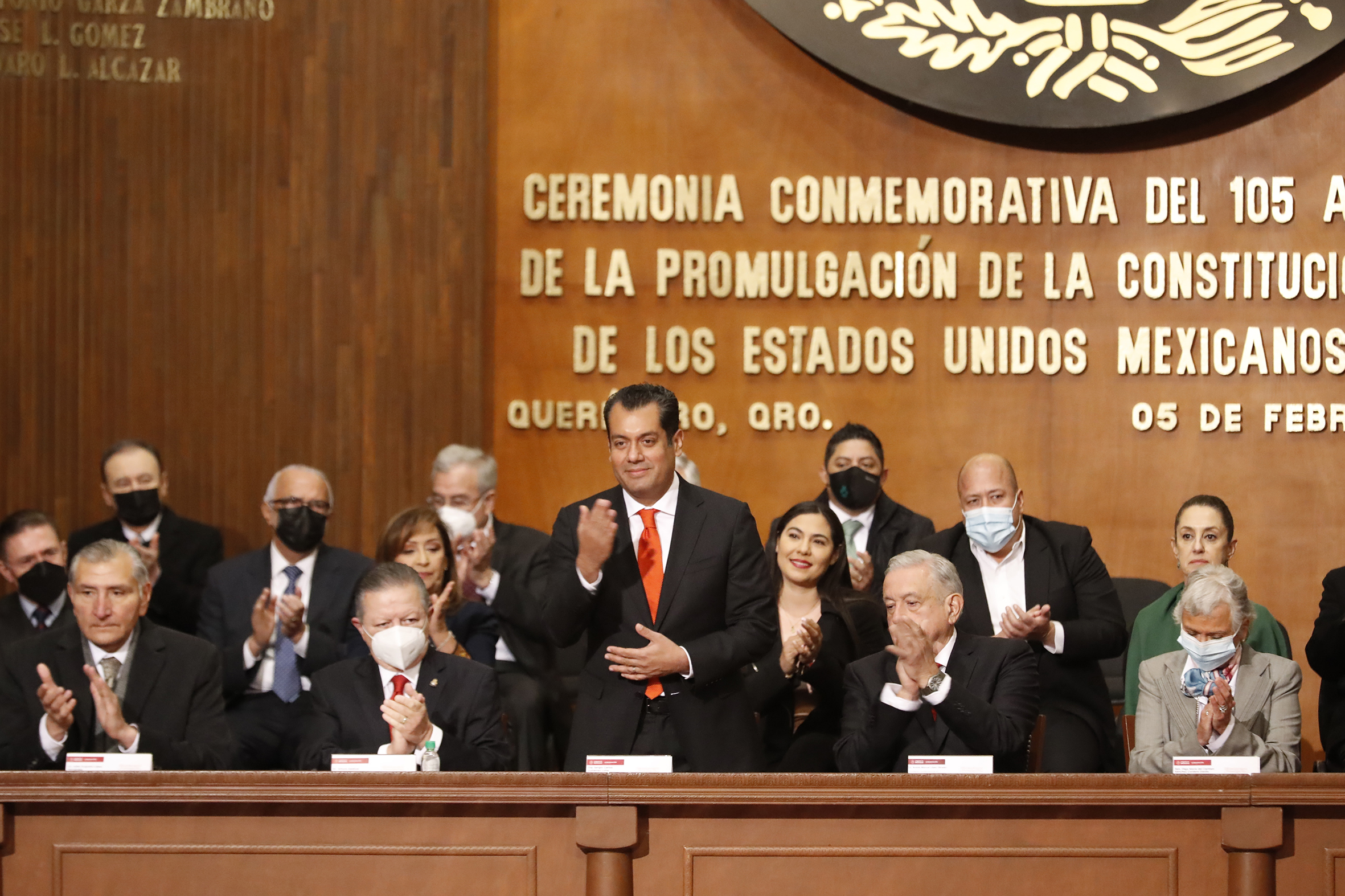 Dr. Arturo Zaldívar, Presidente de la Suprema Corte de Justicia de la Nación; Dip. Sergio Gutiérrez, Presidente de la Mesa Directiva de la Cámara de Diputados; Lic. Andrés Manuel López Obrador, Presidente de los Estados Unidos Mexicanos; Sen. Olga Sánchez, Presidenta de la Mesa Directiva de la Cámara de Senadores y Lic. Mauricio Kuri González, Gobernador de Querétaro