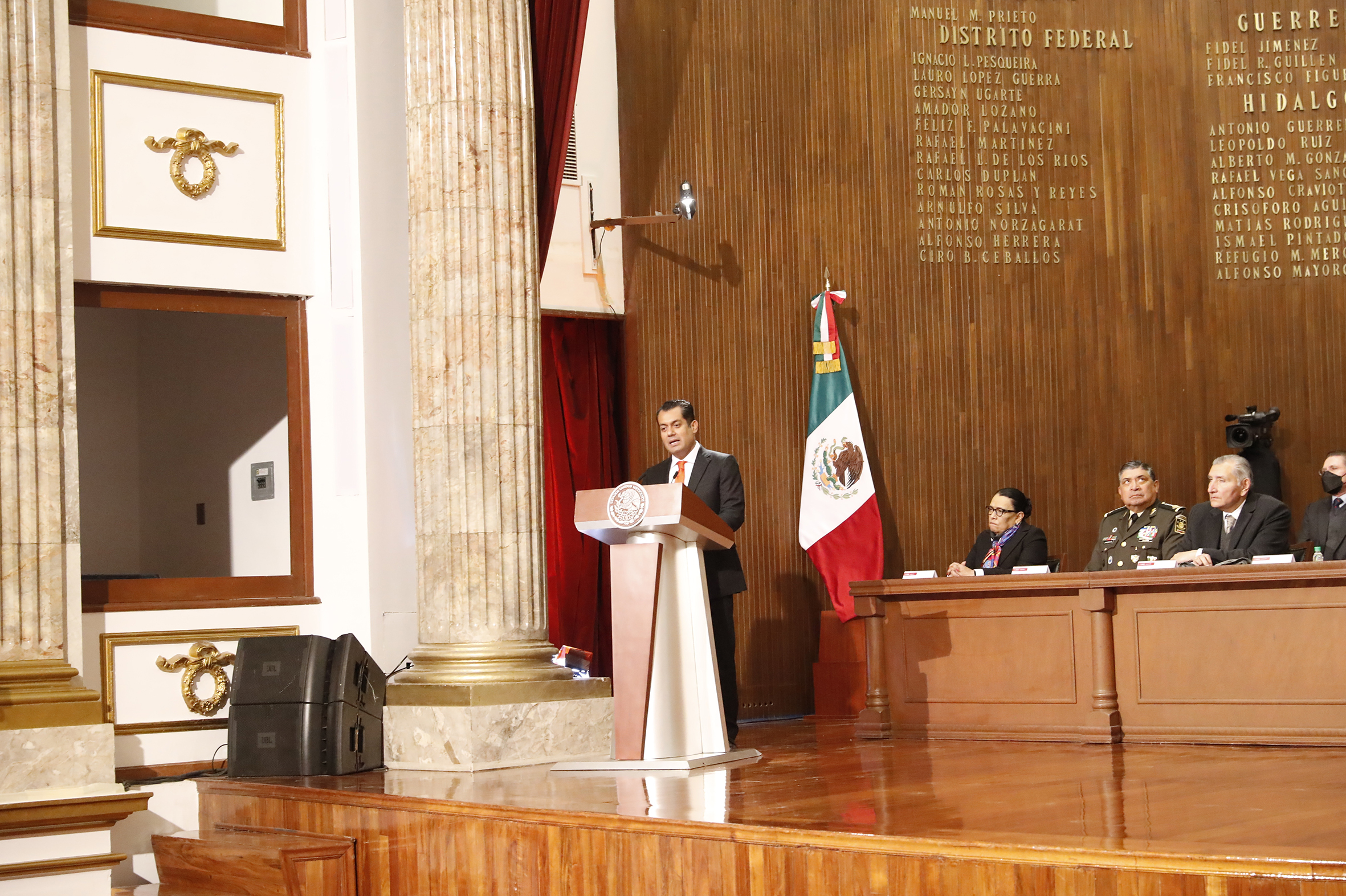 Dip. Sergio Gutiérrez, Presidente de la Mesa Directiva de la Cámara de Diputados, Lic. Rosa Icela Rodríguez, Secretaria de Seguridad y Protección Ciudadana; General Luis Cresencio Sandoval, Secretario de la Defensa Nacional y Lic. Adán Augusto López, Secretario de Gobernación