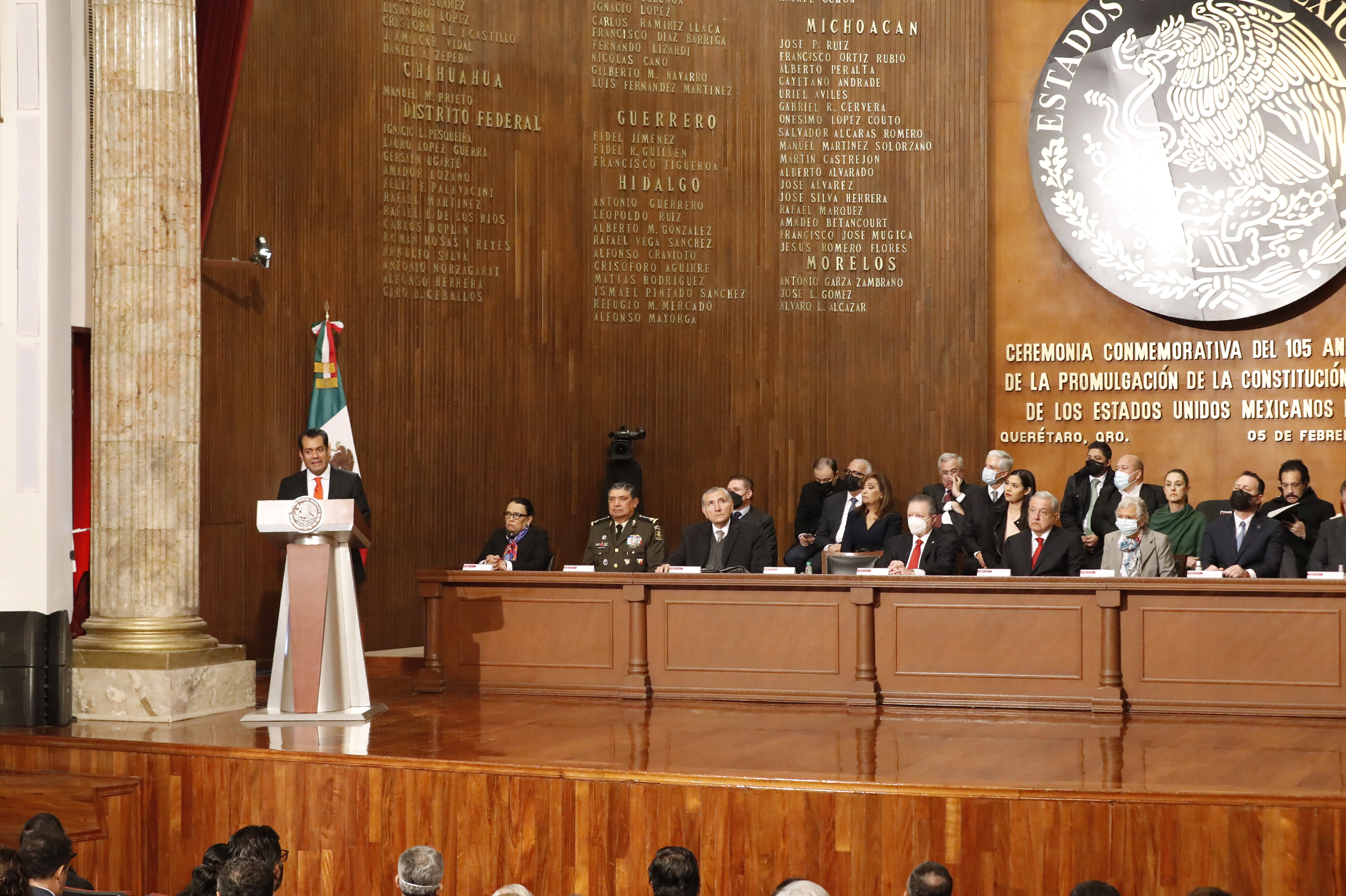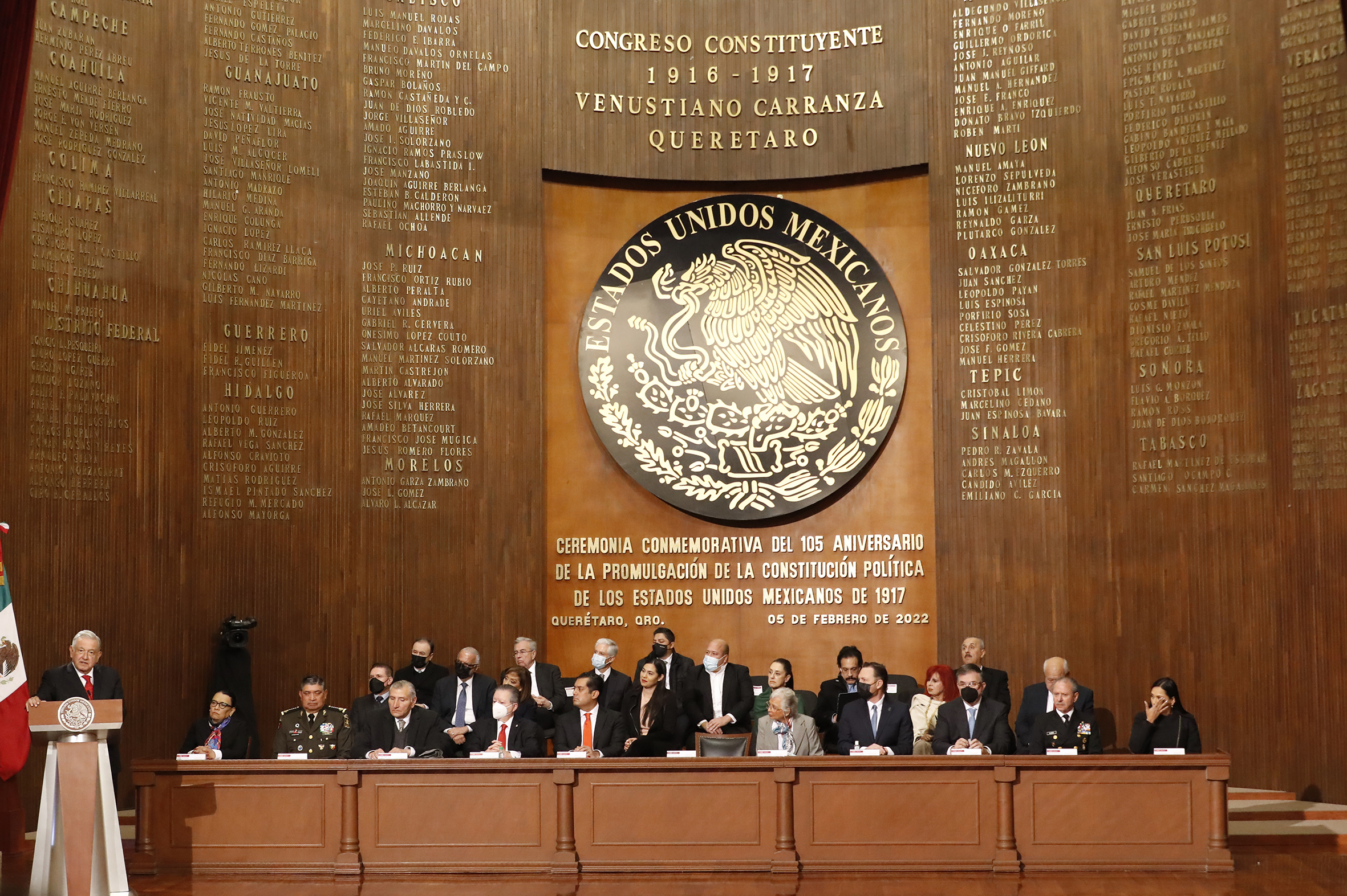 Lic. Rosa Icela Rodríguez, Secretaria de Seguridad y Protección Ciudadana; General Luis Cresencio Sandoval, Secretario de la Defensa Nacional; Lic. Adán Augusto López, Secretario de Gobernación; Dr. Arturo Zaldívar, Presidente de la Suprema Corte de Justicia de la Nación; Dip. Sergio Gutiérrez, Presidente de la Mesa Directiva de la Cámara de Diputados; Lic. Andrés Manuel López Obrador, Presidente de los Estados Unidos Mexicanos; Sen. Olga Sánchez, Presidenta de la Mesa Directiva de la Cámara de Senadores; Lic. Mauricio Kuri González, Gobernador de Querétaro; Marcelo Ebrard, Secretario de Relaciones Exteriores; Almirante José Rafael Ojeda, Secretario de Marina y C. Ariadna Montiel Reyes, Secretaria de Bienestar