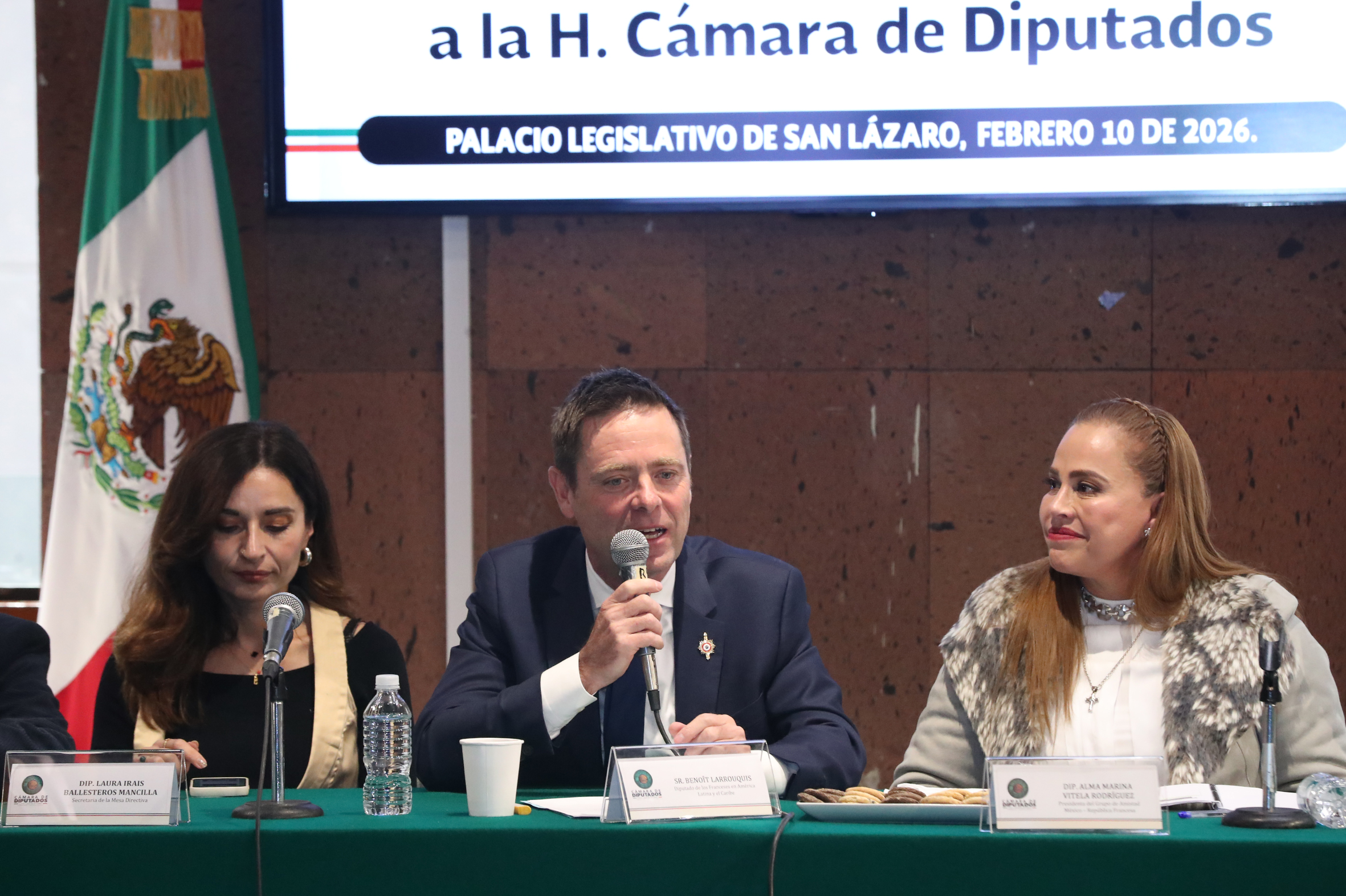 Dip. Laura Irais Ballesteros, Sr. Benoît Larrouquis y Dip. Alma Marina Vitela